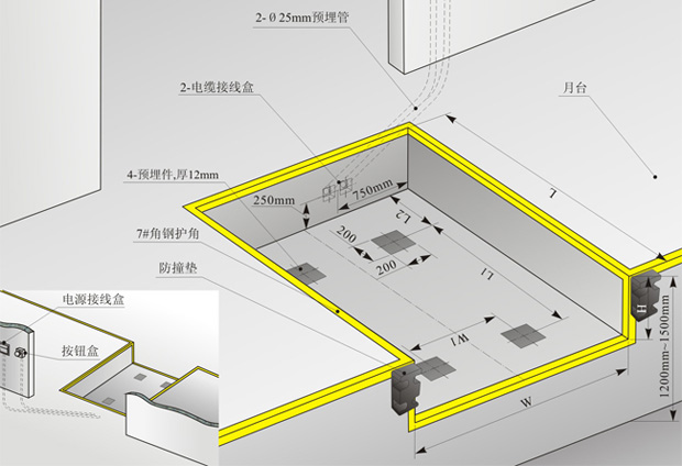 1、兩根預埋管分別走動力電源線及控制電源線,管徑大于25毫米,走向視電源接線位置及按鈕安裝位置。